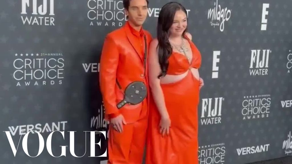 Meg Salter and Paul W. Downs arrive in bright orange at the 2026 Critics Choice Awards in a nod to Kylie Jenner and Timothée Chalamet’s Marty Supreme premiere looks.